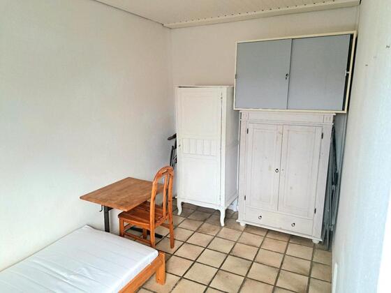 Ein Bett mit Matratze, zwei Schränke, ein Schiebeschrank, ein kleiner Tisch und ein Stuhl stehen zur Verfügung.