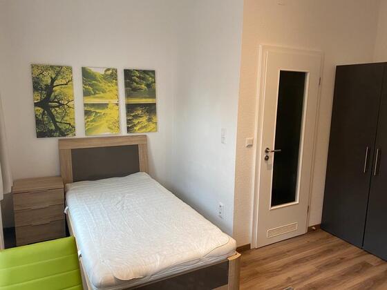 1 Zimmerwohnungen , Dusche , WC möbliert mit Bett, Kleiderschrank , Schreibtisch, Tisch, 2 Stühle und Pantryküche incl. Mikrowelle