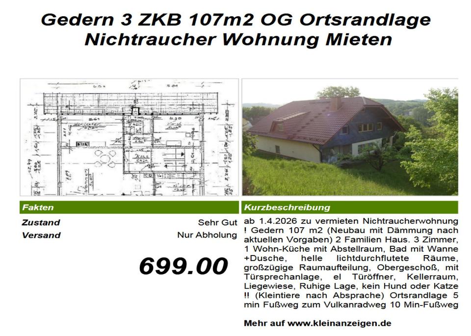 Mehr zum Angebot Gedern 3 ZKB 107m2 OG Ortsrandlage Nichtraucher Wohnung Mieten: